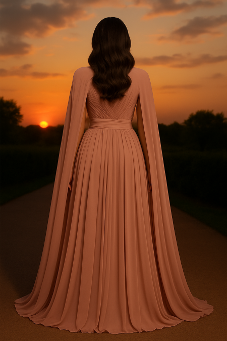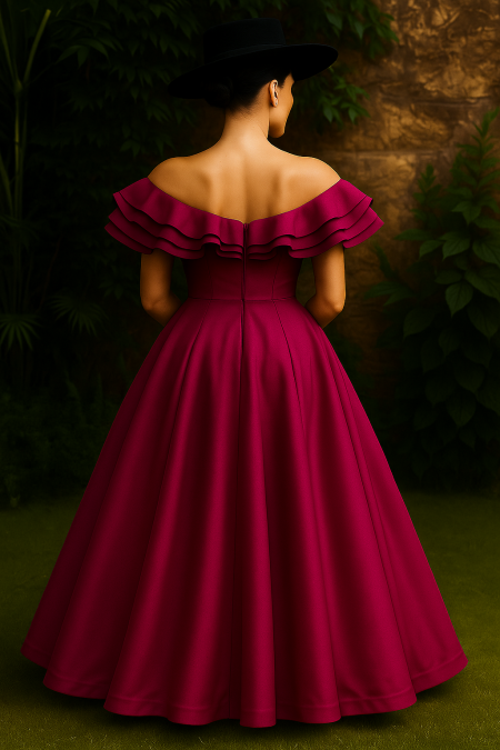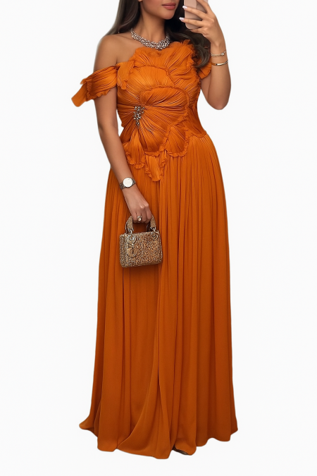 Turn heads with timeless sophistication in this luxurious off-shoulder gown, masterfully crafted in a rich burnt orange hue. Designed with sculpted pleated detailing that forms a graceful floral pattern across the bodice, this full-length dress drapes beautifully with flowing pleats that move effortlessly with every step.